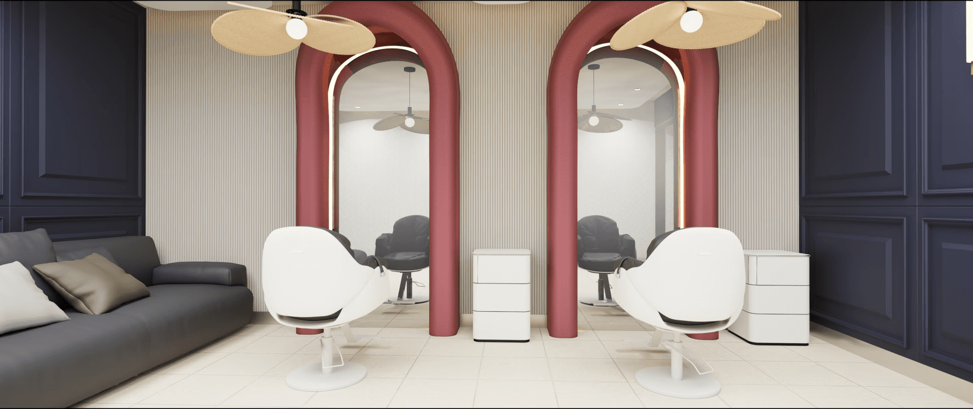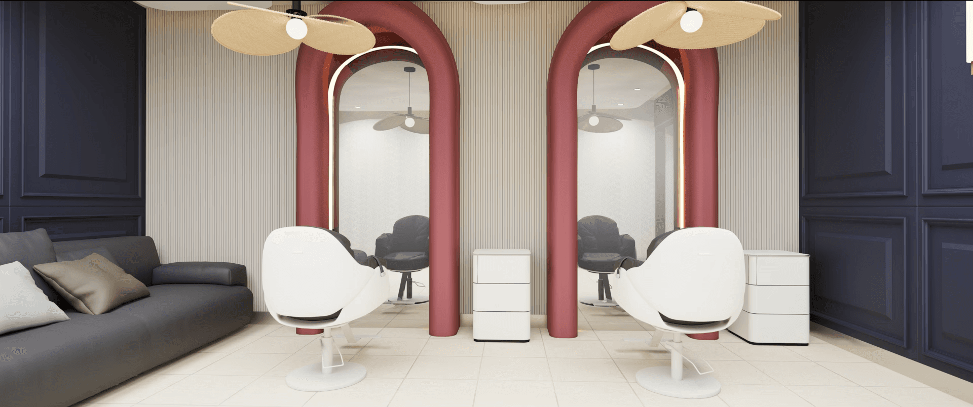 Soft architectural curves, a neutral color palette, and subtle accent tones were introduced to create a sense of flow and warmth. The design avoids visual clutter, allowing the space to feel open, organized, and professional. Lighting was treated as a key design element, carefully planned to flatter skin tones, enhance hair color visibility, and elevate the overall ambience of the salon.